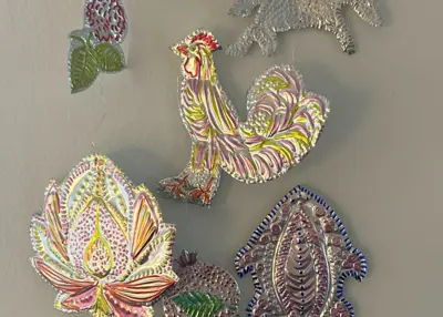 Vi klipper former i metalfolie og præger selv mønstre i dem, farvelægger til sidst alt efter smag. Det bliver til ophæng af håb, der kan hænge som helårspynt, efterårspynt eller julepynt i hjemmet.