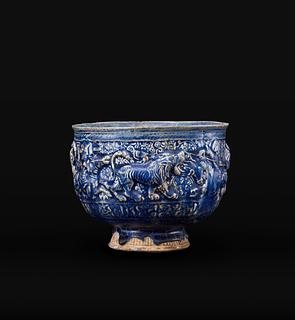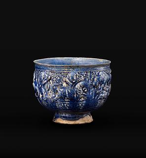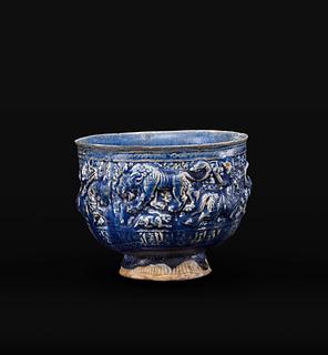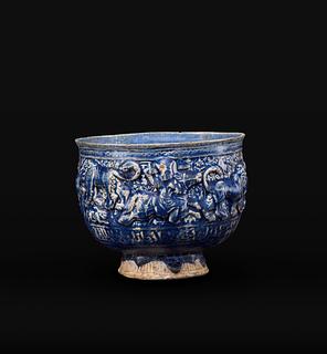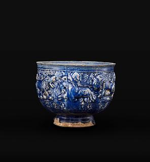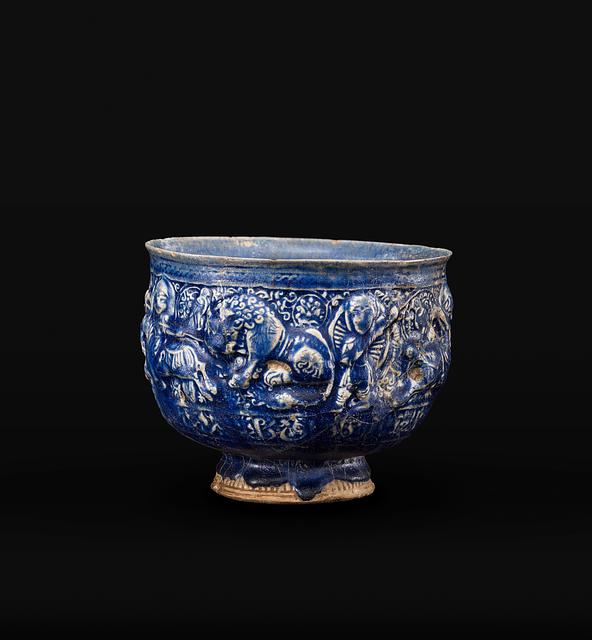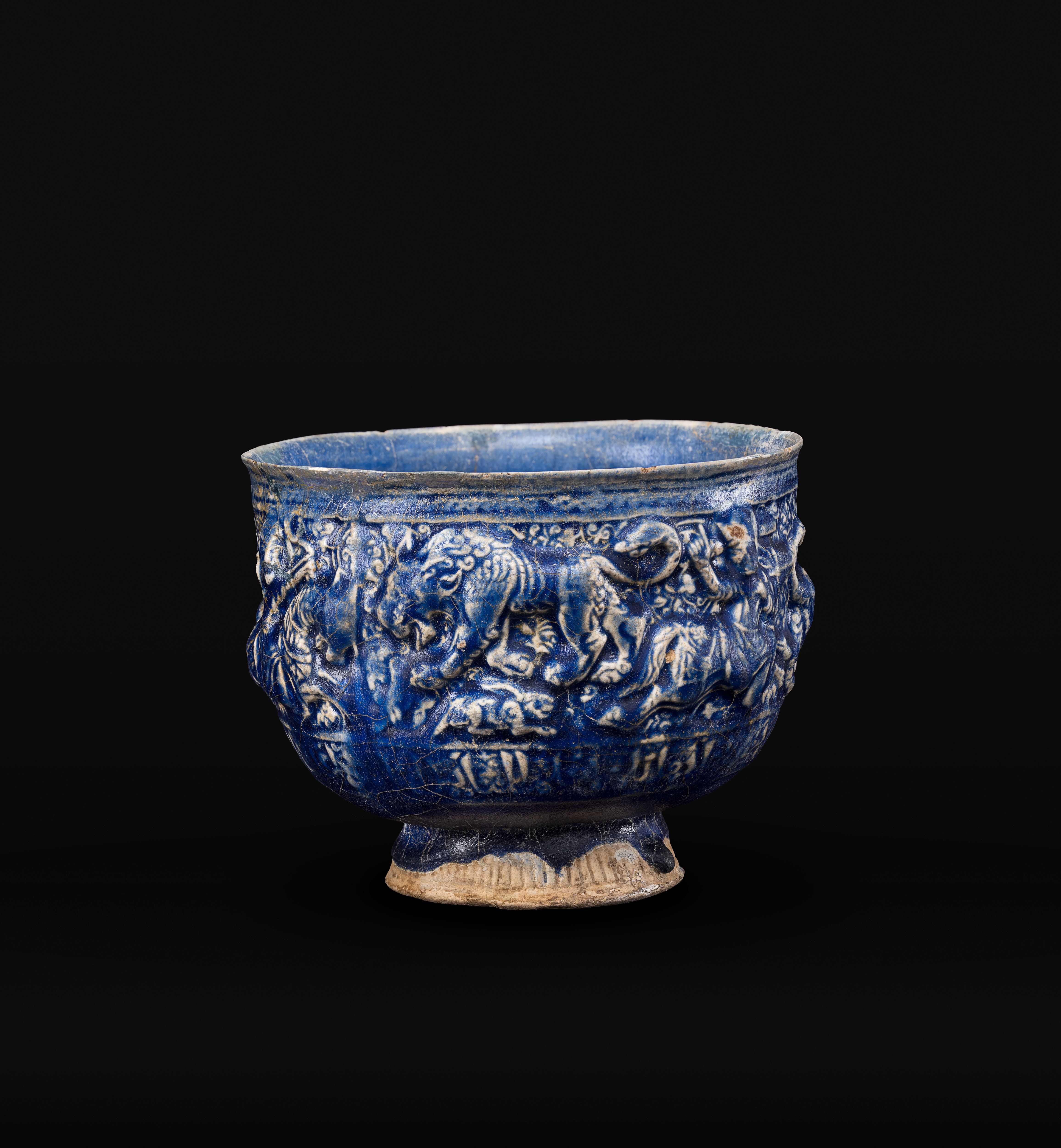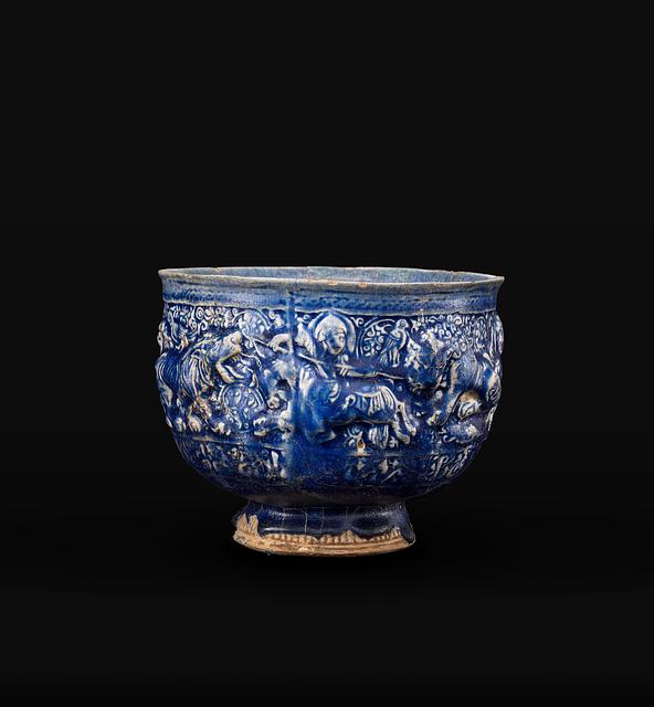 En livlig jagtscene i højt relief pryder denne elegante, tyndvæggede skål. Udstyret med bue og pil, sværd eller lanse og skjold kæmper tre ryttere i fuld galop og en enkelt stående mand mod tre drabelige løver. En hare og adskillige fugle gemmer sig forskræmte mellem baggrundens planteranker. Over den brede billedfrise ses en bort med rebværksornamentik, og under den ses en frise med ikke-dechifrerbar, arabisk tekst udført i naskh-skrift. Den halvkugleformede skål hviler på en udadskrånende, uglaseret fod med lodrette riller. Både ind- og udvendigt er skålen dækket af en blå glasur, og hvor relieffet er højest, fremstår det i godsets hvide farve og fremhæver således motiverne.