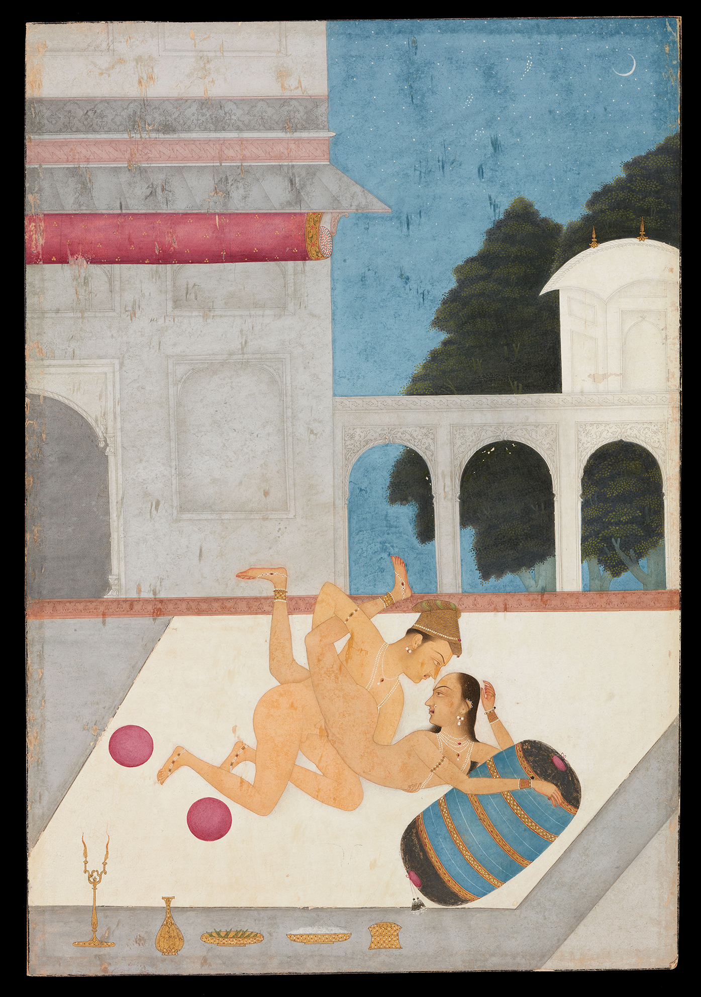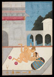Miniaturen stammer fra det hinduistiske fyrstedømme Bikaner, hvis hersker, Maharaja Anup Singh (r. 1669-1698), var tæt allieret med mogulerne. Stilmæssigt ses der tydelige forbindelser til både Mogul- og Deccan-malerierne, men det eksplicitte motiv er usædvanligt for disse to traditioner. I Bikaner var sådanne motiver langt mere udbredte, hvilket kan ses som et udtryk for den centrale rolle som (erotisk) kærlighed, kaldet sringara rasa, spillede i periodens hinduistiske kunst.1
