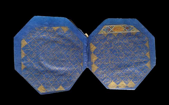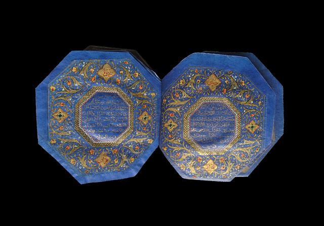 Denne ottekantede Koran er usædvanlig på grund af sin form, sit lille format og sit blåfarvde papir beskrevet med guld-naskhi.