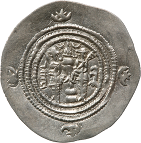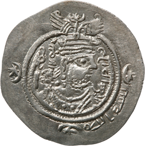 Denne sølvdrakme blev præget under ‘Uthman ibn ‘Affan – den tredje af ”de fire retledte kaliffer”, som de kaldtes af sunni-muslimerne. Med et portræt af Yazdigird bibeholdt på forsiden, regeringsåret 20 – det år Yazdigird faldt – og et zarathustrisk ildalter på bagsiden ligner mønten en traditionel sasanidisk i alle henseender, bortset fra ordene i omskriften, bism allah ”i Guds navn”.