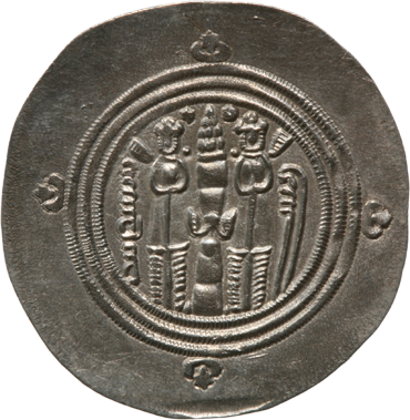 Skønt den stadig bærer Khusraw 2.s portræt, et ildalter, og møntsted samt datering i pahlavi, så er navnet al-Hajjaj og ordene lillah al-hamd (æret være Gud) skrevet på arabisk.
