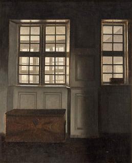 Hammershøis placering af møbler i sine interiører synes ikke altid logisk, som her, hvor den bastante lågkiste bryder med de hvide panelers strukturgivende geometri. Ikke desto mindre giver kisten en fornemmelse af rummet – eller rettere af lysindfaldet fra det tilstødende rum. Kistens lukkede form står desuden i kontrast til vinduerne, hvori lyset udefra åbenbarer sig. Men som i B 312 er vinduerne lukkede, og de giver ikke et udkig til en verden udenfor, hvorfor vi fornemmer, at det ydre synes betydningsløst. Hos Hammershøi eksisterer kun inde.